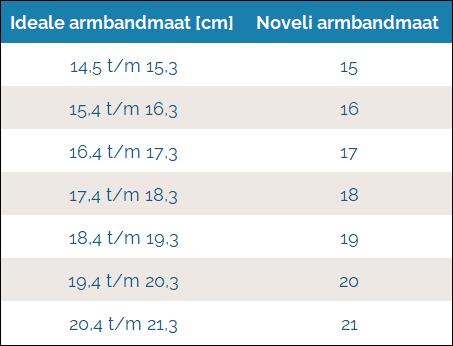 Als u geen maatwerk sieraad wil bestellen dan geven onderstaande maattabellen weer welke standaard Noveli maat overeenkomt met de ideale maat die u in uw mailbox heeft ontvangen.